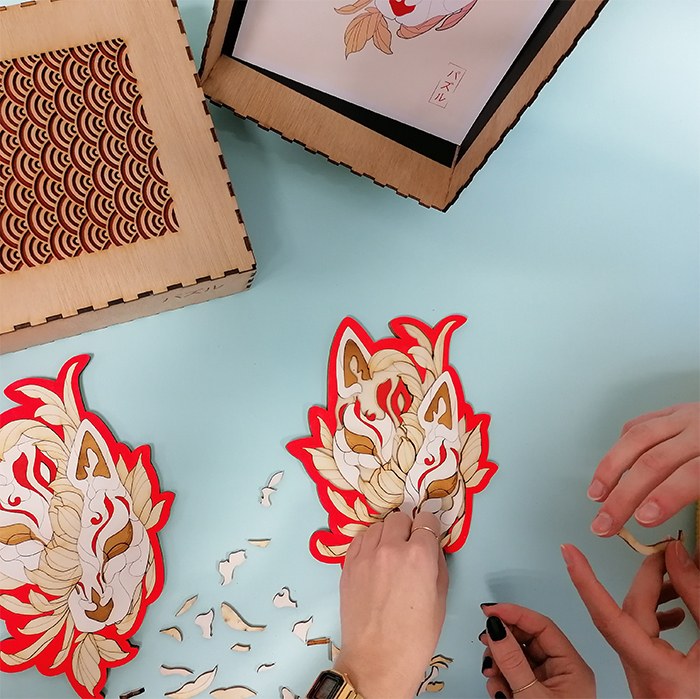 Pour ce projet, j'ai réalisé une envie que j'avais depuis longtemps : créer un puzzle avec la découpeuse laser. Le visuel est inspiré des masques de Kitsune japonais. Dans la boîte, on peut y trouver un affiche